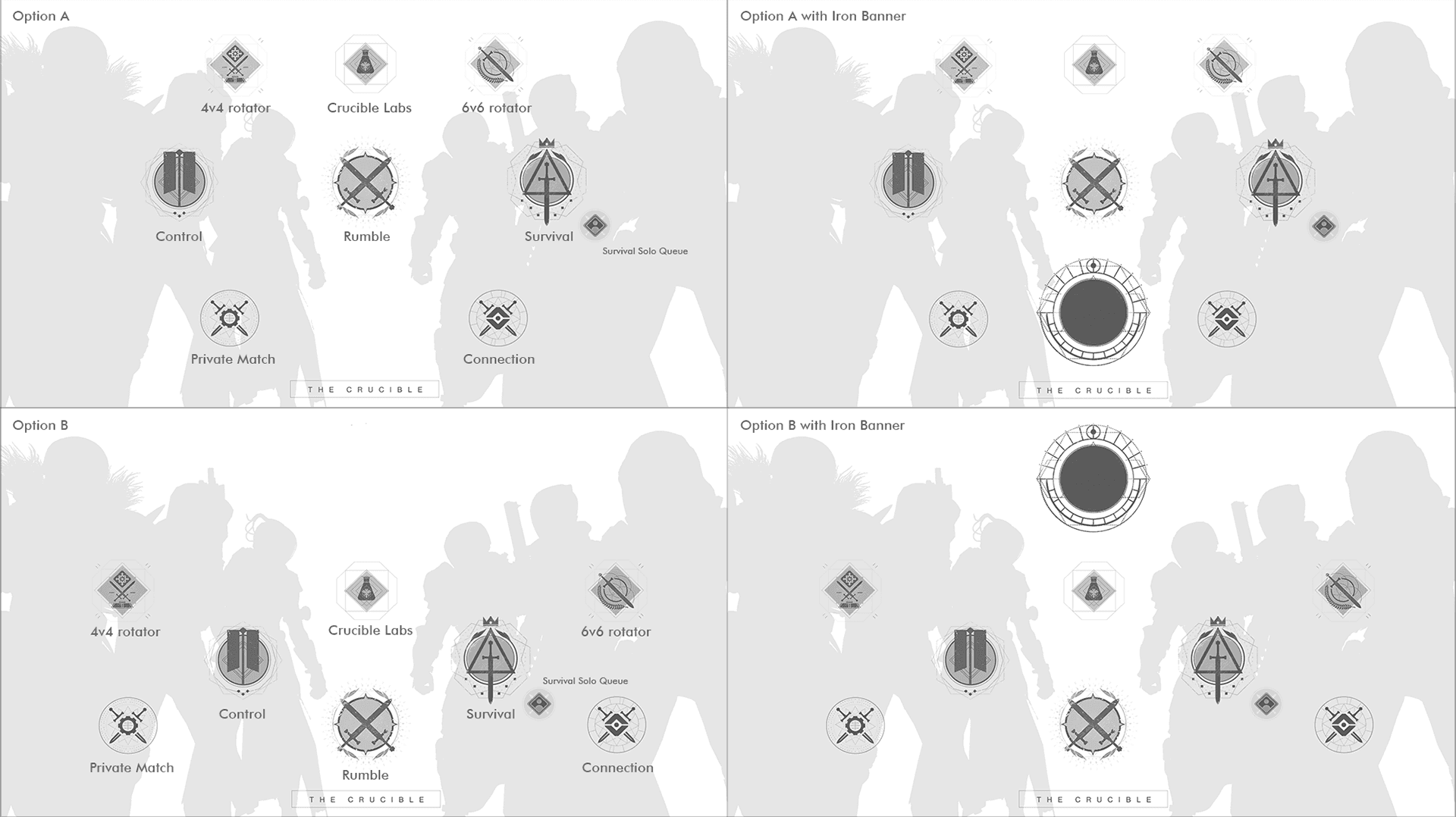 In Season 8 the Crucible UI layout supported up to 6 nodes. At the time, this screen was designed with only visual aesthetics in mind. For Season 9, the PvP designers wanted to add more game modes (aka playlists) for players to choose from. A total of 18 playlist nodes needed to be featured on the new Crucible screen. The layout also required space for the monthly Iron Banner event.